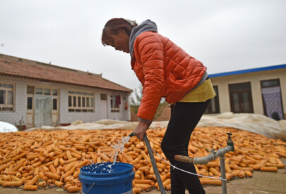 宁夏固原市原州区头营镇胡大堡村村民赵月红在自家院里接水(2015年11月4日摄)