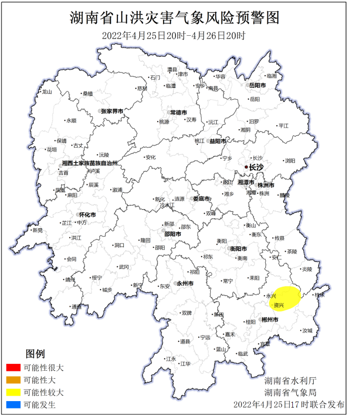 时刻新闻 —分享— 根据湖南省气象台2022年4月25日短期气象预报情况,省水利厅与省气象局联合会商得出如下结论:自4月25日20:00至26日20:00,受降雨影响,郴州市东北部、株洲市西南部发生山洪灾害的可能性较大(黄色预警)。黄色预警区域:资兴市北部、永兴县东南部、桂东县西部局地、炎陵县南部局地、苏仙区东北部局地等。具体预报见附图。预警要求上述地区加强防范,注意做好实时监测、防汛预警和转移避险等防范工作。其他地区也可能因局地短历时强降水引发山洪灾害,需要关注。 来源:湖南省水利厅 编辑:李柯影