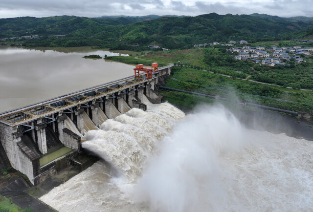 (6月24日下午6时,洪江市托口水电站主坝以每秒7000立方米流量泄洪。杨锡建 向华 摄)