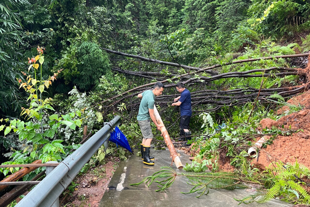 (6月24日,通道侗族自治县陇城镇红星村,当地干部在查看道路受损情况。李尚引 吴波 摄)